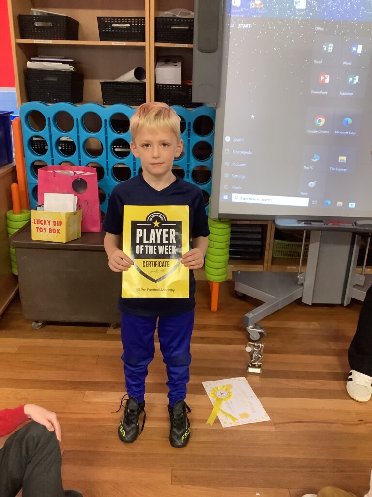 We are so proud of Grayson for impressing his coaches at football. His hard work was celebrated with a player of the week award! Well done.