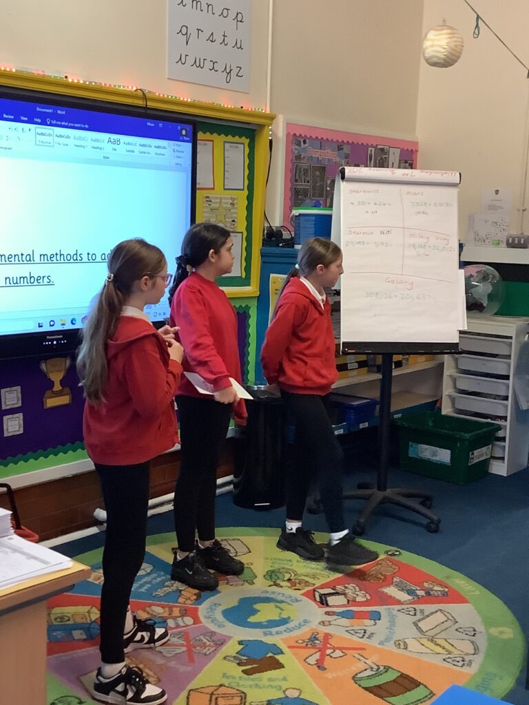 This week in numeracy we have been working hard on our understanding of mental math’s strategies when adding and subtracting larger numbers. We worked out calculations and then became masters … sharing our knowledge with our peers.